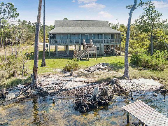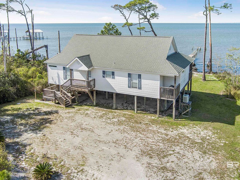 Serene waterfront retreat on Bon Secour Bay! This exquisite home boasts breathtaking views of the bay from every angle, with the added luxury of a screened-in balcony for bug-free outdoor relaxation. Every bedroom features an attached bathroom, offering convenience and privacy for all occupants. Plus, a charming loft room provides a perfect play area or cozy hideaway for the kids. Featuring open living areas with vinyl plank flooring throughout, chef's kitchen with incredible cabinet space, direct Bay front windows, and the potential to build your dream dock for water enthusiasts. Enjoy stunning sunsets and gentle breezes from your private sanctuary. Perfect for relaxing weekends or entertaining guests. Whether you're seeking a full-time residence or considering a lucrative rental property, this home offers endless possibilities for coastal living on Bon Secour Bay!
