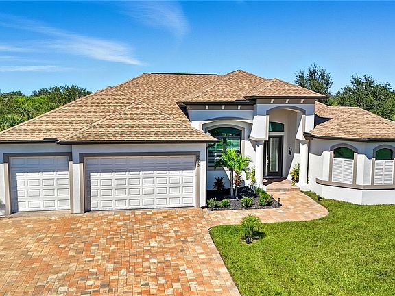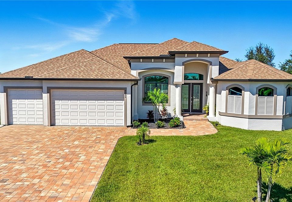 Built in 2023, this immaculate home offers soaring 14-ft ceilings, abundant natural light, and refined details throughout. The chef’s kitchen boasts Brazilian granite, Italian tile, GE Profile appliances, and a custom wood-tone range hood. The primary suite features a tray ceiling, pool access, and a spa-like bath with Roman shower, dual heads, and soaking tub. Additional highlights include two guest bedrooms, a den with French doors, plantation shutters, wide-plank tile, and soft-close cabinetry. Step outside to your private oasis with an expanded jetted pool and oversized lanai, perfect for Florida living. A 3-car garage with epoxy floors and a golf cart bay completes the package. Located in South Gulf Cove with optional HOA benefits, including a community boat ramp for Gulf access and with a beach nearby, schedule a showing today!