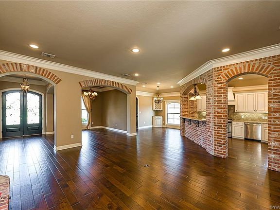 You are going to love this Twelve Oaks home located on large lot and adjacent to the park! Prime location! Open floorplan with spacious living and dining area open to awesome kitchen with charming brick wall and updated with wood flooring. Great home for entertaining and family living! Remote master and pretty master bath. Lovely curb appeal. 3 car garage and new roof!! 4th bedroom is large room- could be bonus room or playroom.