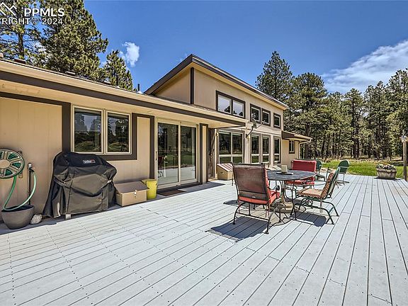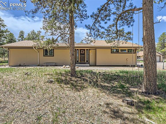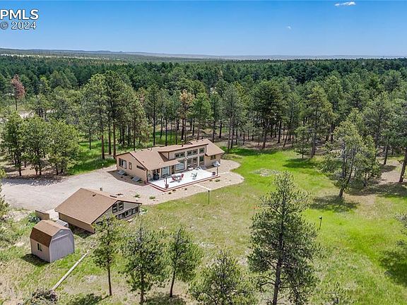 Great room concept rancher on five beautiful acres in southern Black Forest. This six bedroom/four bath home features a beautiful gathering area with high vaults and transom windows overlooking the manicured five acres with old growth ponderosa pine. Close to schools, shopping, and popular hiking and riding trails nearby with Section 16 and The Pineries. Very private and hidden from the road, you enter property through custom front doors with gorgeous brick paver flooring and a great room concept with a wall of windows letting the sun and nature come in. The living room/dining room great room is perfect for gatherings and entertaining. The kitchen has a morning sitting area plus laundry and walk out to a large, composite deck for evening visits. The master and bath are separated from the other three secondaries on the main level. Very hard to find floorplan with multiple bedrooms/office area/flex rooms on the main. The basement has two bedrooms and bath plus a family room and kitchenette/bar area, plus an additional flex/craft room. The oversized, detached, two car garage is extra deep with workshop area/shelving. The home is beautifully appointed with attention to detail, high vaults, electric forced air heat and lots of solar gain plus exterior cement siding. No HOA and expired covenants. District 20 schools, great location to commute to Springs or Denver, elegant rural living while being minutes from shopping and restaurants in Springs or Falcon. Easy commutes to Springs or Denver.