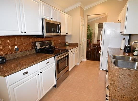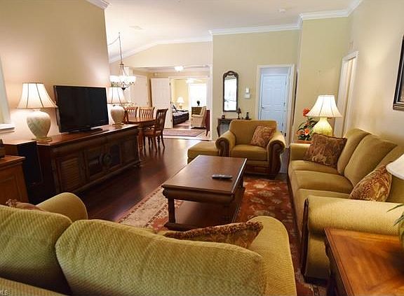 BEAUTIFULLY FURNISHED WITH CINDY CRAWFORD "ISLAND STYLE" FURNITURE . EXTENSIVE UPGRADES IN THIS PRISTINE HOME ! Plantation shutters on EVERY window, Accordion shutters on EVERY window and lanai opening, Beautiful crown molding THROUGHOUT, Gorgeous Brazilian Cherry Wood floors in living, dining, & master bedroom with engineered cherry wood in guest room and den. Rain gutters ALL AROUND home, GRANITE countertops in kitchen with S/S microwave, dishwasher, and range less than 1 yr. old. Copper sheet tile on kitchen backsplash. Gorgeous Front load washer & dryer less than 1 year old. Master shower provides handicap grips with newer shower sliding door. All wood trim and door have been recently painted. LED lights in kitchen, guest bath, & laundry. ( Don't replace lights for 20 years.) Brand new disposal in kitchen. Painted garage door. Maintenance free home in a community with 18 hole golf course (this home is on the "pay as you play" side), 10 tennis courts, 7 pools, and Restaurant with weekly entertainment. SOUTHERN EXPOSURE SO LIGHT ALWAYS RADIATES INTO HOME ! This one is a great buy and a must see !!