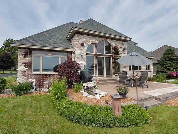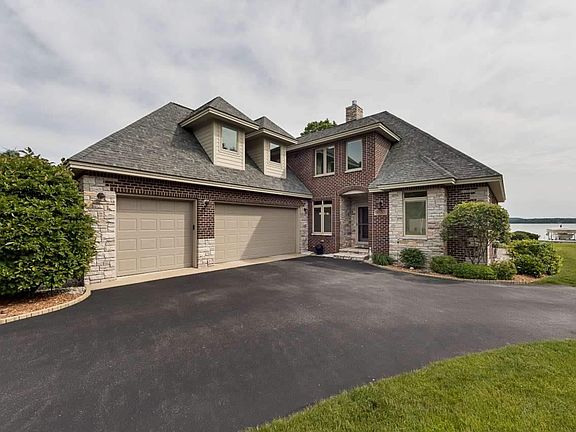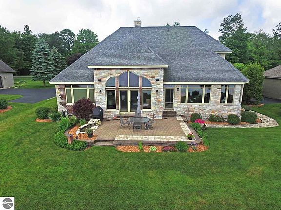 ELK LAKE CLASSIC AND TIMELESS BRICK & STONE ESTATE STYLE home in the exclusive Shores of Palastra, this home is ready for you and your family to begin enjoying the up north waterfront lifestyle. You will be impressed by the gorgeous lake views that greet you as you step into the foyer of this well designed and quality built home by local craftsmen. A soaring sandstone gas log fireplace with a Juniper mantle graces the two story vaulted ceiling living room; the cooks in your family will love the spacious professionally designed kitchen with quartz countertops, cherry cabinetry and high end appliances; gather your family in the formal dining room for memorable meals; 10 foot ceilings on the main floor add to the feeling of spaciousness; 6-panel custom Cherry doors; stunning Brazilian Cherry hardwood floors, trim and cabinetry throughout; sunroom conveniently located off the kitchen and casual dining area; room for your family and friends with 3 bedrooms plus a bonus room; main floor office/den; main floor laundry room. The main floor master suite overlooking the lake will be your private sanctuary with tray ceilings, a luxurious master bath and spacious walk-in closet. Extra amenities include energy efficient Pella windows; a Generac generator; security system; encapsulated crawl space; central air conditioning; 40 year shingle roof; lake draw irrigation system. The three car garage is heated and features a workbench area. The vibrant colors of the sunrise will greet you each morning, the stone patio will be the place to relax while listening to the bubbling waters of the unique water feature from the artesian well, 96.4 feet of frontage with a sandy beach area; the professional landscaping complete the picture perfect setting. Shores of Palastra development is enhanced by 26 acres of common land and in a convenient location close to Traverse City with an array of cultural, dining and shopping venues and just a short drive to the quaint Village of Elk Rapids.
