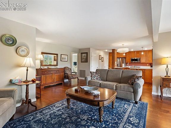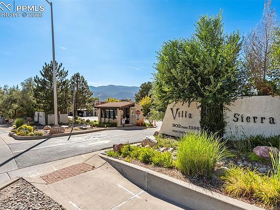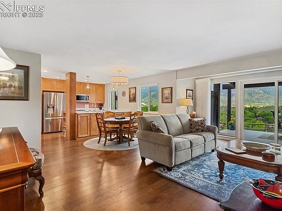 Truly remarkable opportunity. Views of Pikes Peak and the surrounding range are astounding. Even Garden of the Gods. And you enter the home on the ground floor - no stairs. Finally! One level living. On the other hand - active persons' delight with tennis, swimming, walking/hiking right out the front door. Close to parks and not far from thoroughfares, shopping, restaurants, and downtown Colorado Springs. The home has been thoughtfully and tastefully updated by the current owners, wall to wall and floor to ceiling. The ample living area avails a cozy setting with gas fireplace and nearby walkout to an expansive covered deck offering awe-inspiring westward views. The ease of living is furthered by the efficient and updated interior with engineered hardwood floors and re-finished ceilings throughout. Enjoy the comfortable, open, family room with a strategically situated corner fireplace. The roomy dining area naturally flows to the remodeled kitchen which sports custom made maple cabinets, quartz countertops, and all LG appliances - gas range/oven, microwave, dishwasher and refrigerator - and a pantry with pull out shelves. The adjacent laundry has an LG stacked washer and dryer. The spacious primary suite includes an attached, tastefully tiled bath with a walk-in spa shower and a large walk-in closet. The ample secondary bedrooms also have the hardwood flooring. One of the secondary bedrooms is cleverly furnished with a Murphy bed - looks like a stylish built-in book case but easily transforms to a comfortable queen sized bed for your guests. This wonderful home is ready for you. You can be confident that it delivers efficiency, security, comfort, and style. And, WOW! The view!