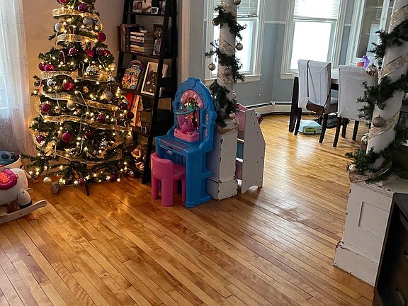 The apartment with two bedrooms, kitchen, dining room, and living room. Hardwood floors. There is one parking space on the driveway. Tenants pay heat and electric, it's very efficiency new natural gas boiler. Landlord pay water and sewer. Two bedrooms apartment, hardwood floor throughout. New paint. Parking on side. The rent is $2000 Tenants pay heat and electricity.