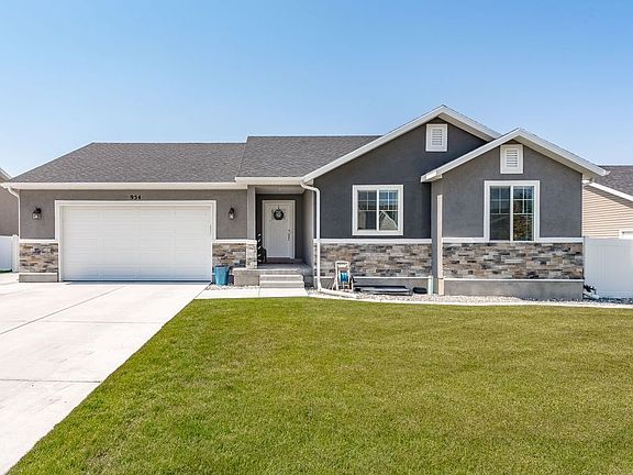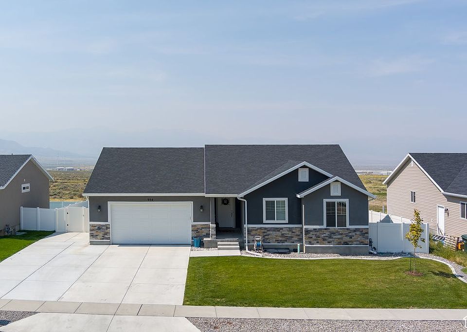 Welcome to this beautifully designed rambler featuring modern finishes and stunning curb appeal. You'll love the soaring vaulted ceilings, stone-accented fireplace from floor to ceiling, and large windows that fill the home with natural light. Quartz countertops throughout, white cabinetry, a spacious island with bar seating, and a seamless flow into the dining and living areas-perfect for entertaining. The basement features professionally finished great room, 2 additional bedrooms and a bathroom. Outside is just as appealing, enjoy a fully fenced yard with gorgeous mountain views and no backyard neighbors. With its stylish finishes and move-in ready condition this home is the perfect blend of comfort and convenience. Square footage figures are provided as a courtesy estimate only and were obtained from county records. Buyer is advised to obtain an independent measurement.