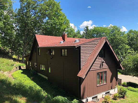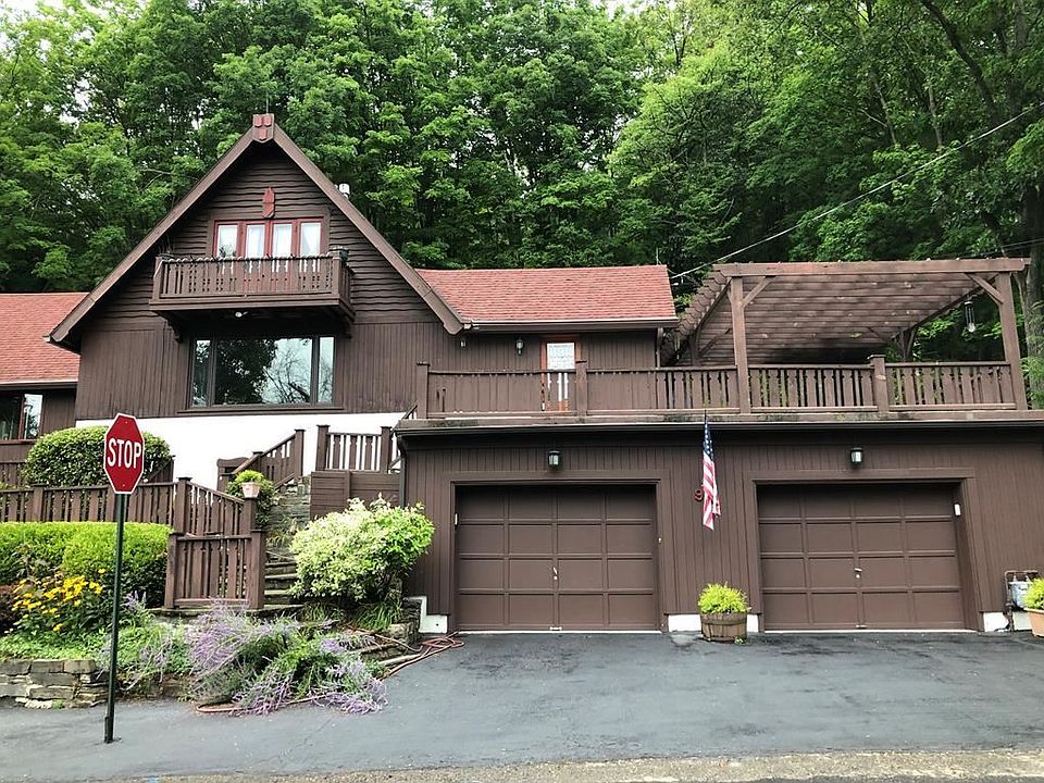 Own this rare and unique Swiss Chalet design home in quiet West Elmira area. This 3 bedroom / 2.5 bath home offers living space on 3 levels, and is perfect for entertaining. Beautiful hardwood floors & woodwork highlight this home. Newer kitchen, 1st floor owner suite, cozy living room w/fireplace, 4 season room w/circular fireplace & closet space galore are just some of the features. Enjoy nature from the huge deck on the sprawling 1.5+ acre partially wooded lot. Large bedroom on 2nd floor could be guest suite. Rec room with fireplace plus gym/den room in basement. Attached 2-car garage.