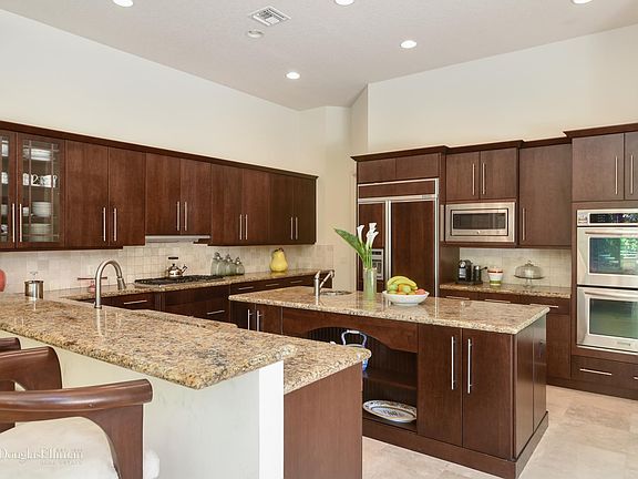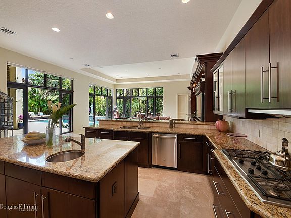 This Beautiful two story Balmonte Grande III Estate home located in the Prestigious gated community The Oaks at Boca Raton. State of the art kitchen featuring top of the line appliances, granite counters, cherry cabinets. Designer Mahogany built in Wall Units in Family rm, Master Bdrm suite (1st level), Library and Media Rm. Impressive Custom Wrought Iron Gate at front door entrance, Beautiful Exotic Wood Floors and Polished Saturnia Marble. Gorgeous Palm Beach Style Pool area with Lush Landscape enhancements. Fabulous Viking State of the art outdoor Grill area. Cabana bath convenient to pool area with Italian statues and urns creating a European ambiance with California style Hurricane impact glass double doors that open onto Veranda.