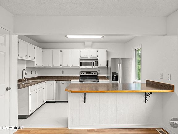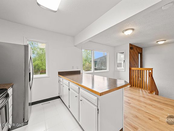Freshly painted and new flooring almost everywhere in this great townhome south of Dimond blvd, that is an end unit with a fully fenced backyard. It has a brand new heating system, and updated shower in downstairs BA. Convenient location for groceries. Upstairs features 2 BR, living room w/ a fireplace, open kitchen and bathroom, downstairs 1 large BR W/ BA. Separate RV prkg lot and tenniscourt.