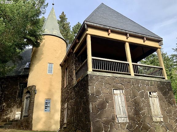A real castle nestled in an enchanted forest of firs not far from the sandy beaches of Gold Beach in a private setting. This very unique & rare find boosts many different levels. There is a 3 car garage with a hydraulic lift system on the 1st level. The living room, family room & kitchen on 2nd level & 2 bedrooms & 1 bath on 3rd level. Tile floors w/Mahogany inlaid, Propane fireplace, copper roofing, & copper accents throughout the home.