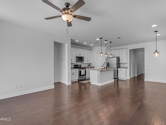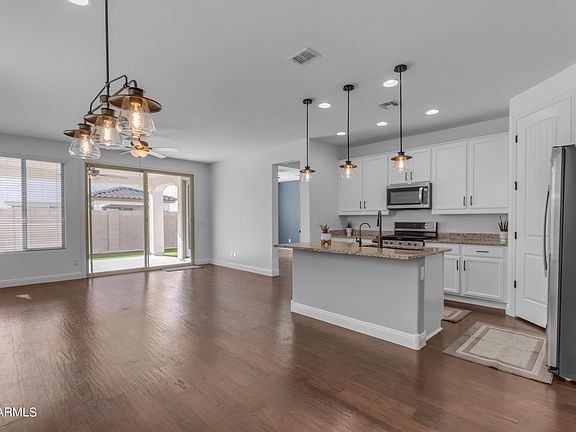 Step into luxury with this 4-bedroom, 2.5-bathroom masterpiece in the coveted Cadence subdivision by Eastmark! Spanning 2,341 square feet over two stories, this residence exudes sophistication with pristine wood floors, elegant plantation shutters, granite countertops and a chic open concept living adorned with freshly painted white cabinets and interior. You will love the spacious loft, downstairs Master Bedroom, and walk-in closets in all 3 other bedrooms. Embrace culinary delights in the heart of the home while brand new turf, a great sized covered patio, and low maintenance backyard will complete the indoor outdoor living. Indulge in the convenience of a tankless hot water heater, soft water system, RO System, and epoxied garage floors with built-in custom cabinetry Beyond your private oasis, the Cadence community offers a resort-style experience with pools, spas, a Moto Fitness Center, a Community Center for hosting events, as well as, Game On, which is loaded with new and older games. There are six parks, a dog park, and courts for basketball, volleyball, tennis, and bocce. Education excellence is assured in the A-rated Queen Creek School District. With all of this is perfectly positioned next to Mesa Gateway Airport, the 202 Freeway, Legacy Park, ASU Polytechnic, the Apple Data Center, and just a few miles from the San Tan Mall and Top Golf. Elevate your lifestyle in this inviting haven where upscale living meets community charm!