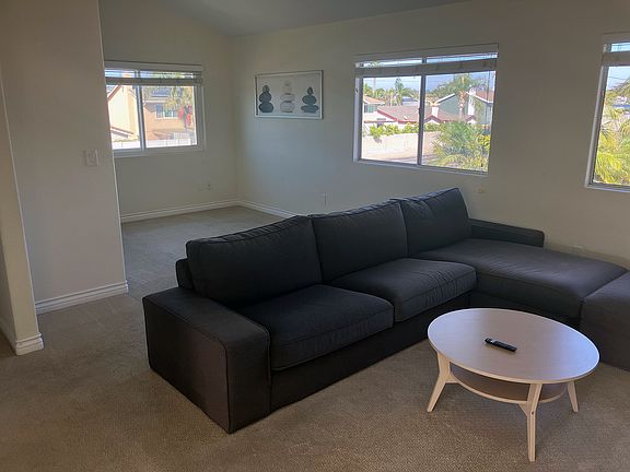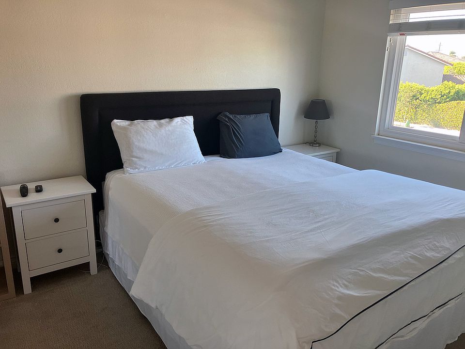 Large private bedroom with high ceilings, California King bed, ceiling fan, carpeted floors, and a lot of closet space. The bedroom is on the second floor with an exclusive living room, office area, and a nice panoramic view of the neighborhood. The living space is extremely clean and minimalistic. Private bathroom with two sinks and a stand in shower. A state of the art kitchen with cook wear, utensils, plates, and bowls. A large lap pool with lounge and sun tan chairs. The home and grounds are well maintained and clean. The pool is cleaned and gardeners come once per week. The home is cleaned by house keepers once every month or two as needed. The outside is pest controlled once every three months. You are very close to the beach and get an ocean breeze throughout the day. There are many windows to be opened to get fresh air. The neighborhood is exquisite and the walks around the beach fill you with health. The lease will be a month-to-month rental agreement. A background check and renters insurance are required. Electricity, gas, water, internet, and garbage are a flat $150 per month. Parking will be on the sidewalk right in front of the home. No smoking inside the home. No pets please. You are responsible for maintaining your own area and keeping it clean.