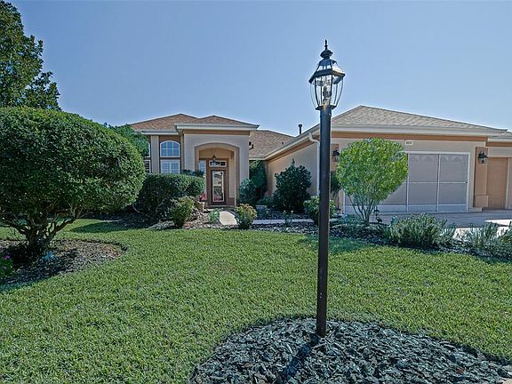 Discover your dream home in this exquisite 1936 sq. ft. Sanibel model sanctuary, where every detail has been thoughtfully curated to enhance your daily life. As you step into the inviting living room, you're greeted by warm, rich hardwood floors and a flood of natural light from large windows, creating an atmosphere of openness and tranquility. Plus, a beautiful glass entry door leading to an inviting foyer. The heart of this home is the beautifully appointed kitchen, featuring sleek stainless-steel appliances, elegant granite countertops, and crisp bisque cabinetry. This culinary haven is perfect for both everyday meals and entertaining guests, with ample space to unleash your inner chef. High ceilings and beautiful arched windows enhance the dining area. Retreat to the luxurious primary bedroom, a spacious 270 sq. ft. oasis designed for ultimate relaxation. The en-suite bathroom boasts a indulgent soaking tub and a separate shower, providing a spa-like experience in the comfort of your own home. For those who work from home, can the 3rd bedroom can be used as a den. The second bedroom is extended in size and provides versatility, easily transforming into a guest room or hobby space to suit your lifestyle needs. Throughout the home, stylish ceiling fans and carefully chosen light fixtures add both functionality and flair. Features include crown molding, Plantation shutters and more. The harmonious blend of warm and cool tones in the decor creates a welcoming ambiance that will make you feel instantly at home. Outside, lush greenery beckons through the windows, promising serene views and a connection to nature. This property isn't just a house; it's a canvas for your dreams, a place where memories are made, and a testament to your success. The enlarged lanai is great for relaxing and back yard is deep and semi-private. The garage is extended and has a golf cart garage that is enclosed and can be utilized as a large workshop or extra storage. Roof was re-shingled in 2021. HVAC new in 11/2017. Roomy inside laundry with extra cabinets. Embrace the lifestyle you've always desired in this thoughtfully designed, move-in ready home that perfectly balances comfort, style, and functionality.