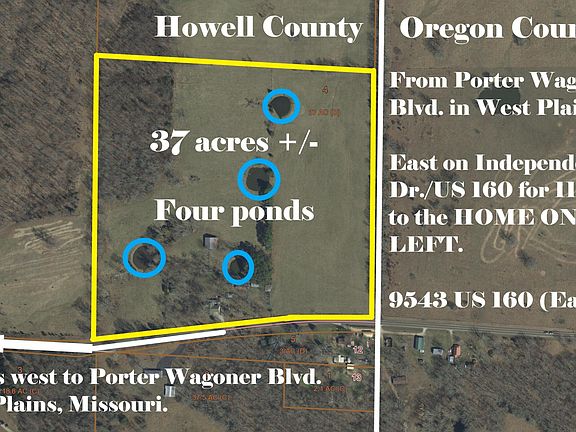Great Hobby Farm located on State highway 160 just out of West Plains. This four bedroom, two bath home boast over 2000 sq ft of living space with an unfinished basement and geothermal heat and air. The 36 acres is a great mix of pasture and some timber with three ponds, a large hay-barn, two equipment sheds, and a nice working barn with head chutes.