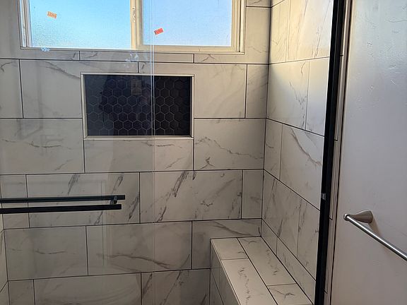 Beautiful tiled shower with built-in bench