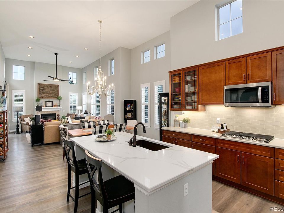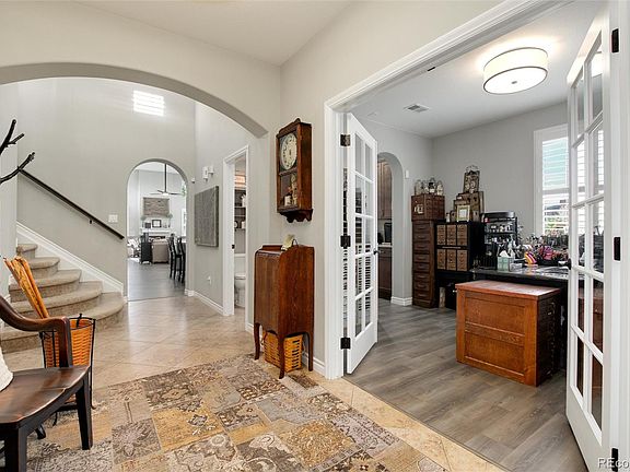 Truly a showcase home within the vibrant, low-maintenance community of Tresana!! Everything you need to enjoy MAIN LEVEL living in style! This home does NOT back up to a retaining wall or another home. To the east the patio overlooks a lovely greenbelt. Arched doorways, new lighting, soaring ceilings, plantation shutters and luxury flooring accentuate the tranquil flow of this unique home. Off of the open concept living area is the private, primary suite with 5- piece bath, walk-in closet, dual vanities, easy access shower, sunken tub and new light fixtures. The kitchen offers gleaming quartz countertops, island seating, cherry cabinets, stainless appliances and an additional prep area with pantry and storage. Tall ceilings bring in the natural light, plantation shutters, gas fireplace and access to the enclosed patio. This home is ideal for entertaining with a spacious kitchen, generous dining area, and bluetooth compatible speakers on the patio. Main floor laundry is convenient and the two single car garages offer storage, shelving and upgraded flooring. A private office with french doors is off the entryway, perfect for work from home or your favorite hobby. Upstairs relax in the loft while enjoying the wildlife, mountain views and down the hall is a full bath and two additional well-sized bedrooms. There is an additional watering system to have hanging plants and pots in the back of the home. Exterior maintenance is covered by HOA and Highlands Ranch offers access to 4 State of the Art Recreation Centers. Tresana offers a wide variety of groups, clubs and outings. The HOA sponsors summer time events, the pool and piazza are great places to gather! The community is walking distance to Trails, Parks, Shopping, Restaurants, Fitness, and allows easy access to the Town Center and C-470.