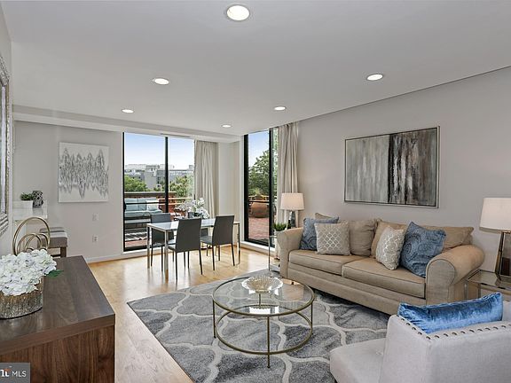 Rare find with dreamy sunsets! Imagine living in this beautiful, bright and spacious 2BD/2BA residence with 3 sets of sliding glass doors opening to a 350 square foot terrace with panoramic western & southern views. 1,400+ square feet , hardwood floors, recessed lighting, Open living/dining room, all white kitchen with breakfast bar. Owner's suite with full bath and walk-in shower. Pets welcome. Home office/2nd bedroom with balcony. 2 garage parking spaces. Desk service, roof deck & guest parking. Walk score of 95. Vacant and staged. Minutes to Whole Foods, Trader Joe's, restaurants, shops, Waterfront, Rock Creek Park, G'town, Dupont, Metro & More!