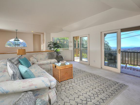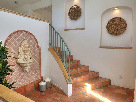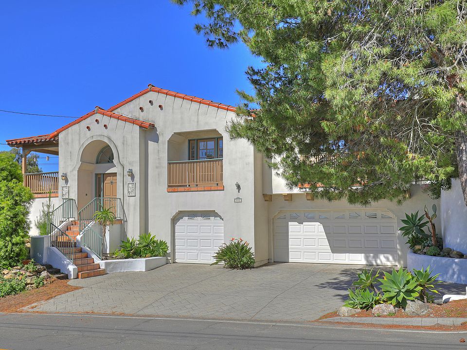 Light filled custom built Spanish home with views of the City and Pacific ocean. As you enter the home you are welcomed by soaring ceilings and wall fountain. The Saltillo tiled stairs guide you to the living room with coffered ceilings and walls accented by niches with recessed lighting. There are double sliders to the wraparound porch to enjoy the views. The kitchen has oak cabinets, Corian countertops and new stainless steel appliances. A breakfast area serves as an informal setting to enjoy the morning views. The formal dining room has several wall niches and opens to the tiled patio. The versatile floorplan offers a spacious master bedroom with walk-in closet, sitting area and a large master bathroom with double sinks, jacuzzi tub
