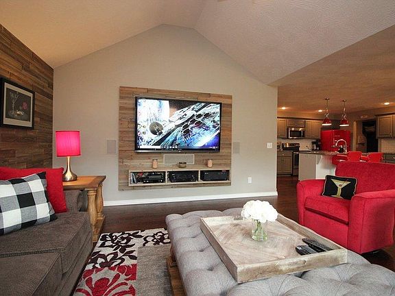 Gorgeous 4 Bedroom, 2 Bath, 3-car split garage home on a corner lot in Summit Meadow Subdivision in Nixa. The open living/dining/kitchen floor plan is warm and inviting with its color and hardwood flooring. You will fall in love with the wood accent wall and built-in entertainment center, plus the television and speakers stay!! Builder upgrades include vaulted & tray ceilings, granite counter tops in kitchen & baths, energy efficient HVAC & stainless steel appliances. Note these added extras: upper-end light fixtures, all black-out blinds with custom wood valances, 6-month old Big Chill refrigerator plus the red retro lights, new red bar stools & custom dog crate with doggie door all stay with the home. Kitchen has island seating, painted cabinets, subway tile backsplash & dining area with access to the back patio. Master suite includes a walk-in closet, walk-in shower and separate, dual vanities. Garage entry has custom mud bench & pantry with convenient access to the kitchen. And look what stays in the garages: 2 storm shelters (one in-ground and one above-ground), all garage shelving & workbenches, mounted TV, industrial natural gas heater, engine hoist, blinds, manual tornado bracings & security system. Plus the patio pergola & patio furniture also stay with the home! There is a double gate on this corner lot & in-ground sprinkler in front yard. This subdivision has a very active neighborhood community with holiday parties & Facebook page. This well-maintained, beautiful home will not last long--don't miss it!