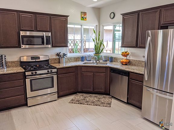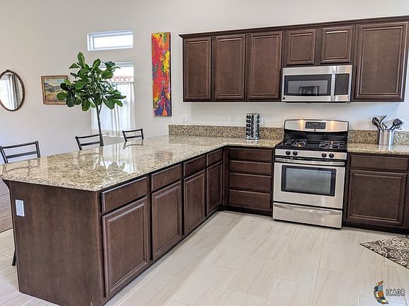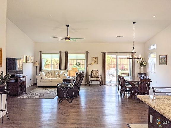 Upscale, beautiful three-bedroom, two bath luxury home in Brawley's most desirable new neighborhood. From the moment you enter the great room with its soaring ceilings, the quality of this house just shines. Lived in less than a year and a half, the fortunate next owner will be rewarded by the benefits of a brand-new home, with impressive improvements. You'll enjoy the professionally landscaped back yard, irrigation system, custom patio and raised bed, upgraded flooring, lighting and ceiling fans, drinking water system, Bali window treatments, privacy fencing, front desert garden, and more. The kitchen is big and gorgeous, with its dark wood cabinets, granite counters, and view out the window. The master bedroom will be your sanctuary, so spacious and airy, with a large en-suite and two (2!) enormous closets.This home invites comfort, and exudes modern elegance. It is a rare find. This home will not be on the market for long so don't delay.