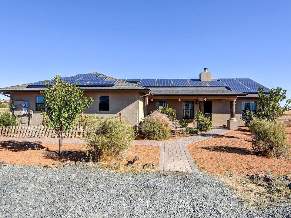 Enjoy the views of the Milky Way from your front porch or Adjacent to Table Mountain with views of the Williams Mountain and San Francisco Peaks. Fruit and nut trees greet you as you enter this view studded home set on 5 acres. This single level split floor plan open-concept home features beehive fireplace, vaulted ceilings, hickory cabinets and new barnwood-look flooring in the bedrooms. The spacious kitchen offer tile countertops and backsplash and a plethora of counter space. The bright and airy master suite is perfect for relaxing with its own sliding door to the backyard. The property offers a barn with four 10x10 stalls, tack/feed shed, large chicken coop and a carport currently used for hay storage. Solar system to be paid off at close, so enjoy the low electric bills.