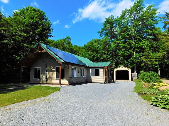 PRICE REDUCED - This 3 bedroom 1 bath home with bonus room will not disappoint. Located 3.1 miles down the Uncas Rd, in Eagle Bay, NY and on the snowmobile trail. There is a great room with pellet stove, living room, dining room, full kitchen, and enclosed heated front porch. On demand hot water, 12 solar panels with 16 batteries, 10 kw auto generator, and a 6000 gas generator. Propane wall heaters and a pellet stove heat this quaint home. Outside you will find a lovely patio area with roof-overhang and a level yard with ample space for entertaining with a fire pit area. A detached heated garage & shed for convenience and storage. This year round home comes fully furnished.