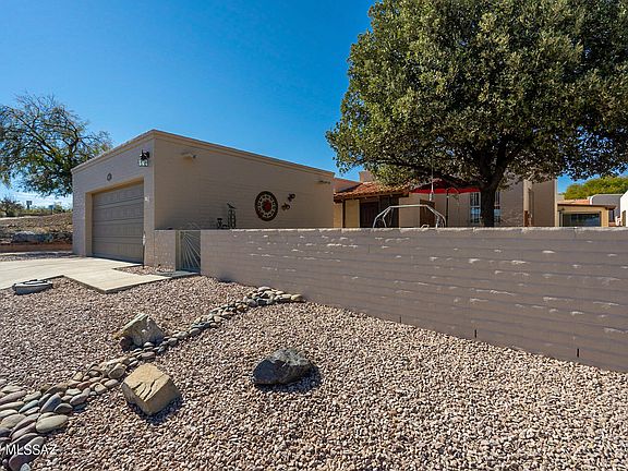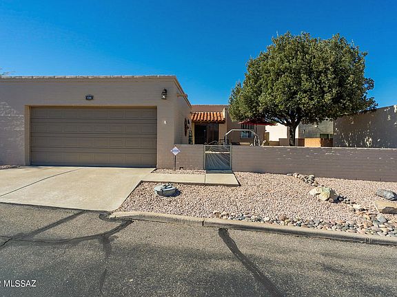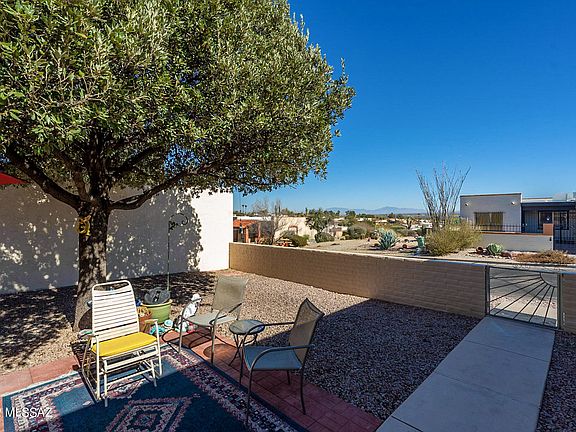 Unique home in Desert Hills I features a very private backyard that backs up to a beautiful common area. The huge walled in front yard offers lots of potential for catching the sunrise with a partial mountain view to the east. You enter through the security screen door to an enclosed patio and then through the front door to a foyer. To the right is the living room with its vaulted ceiling and wood burning fireplace. To the left is the kitchen and dining area with access to the side patio through a sliding glass door. The kitchen is updated with hickory cabinets, pull-out shelves, a center island breakfast bar with drawers and a closet pantry. Behind double doors are the washer and dryer with cabinets above. Down the hall are the 2 bedrooms. First the guest bedroom on the right with sliding