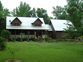HOKES BLUFF AREA RIVER FRONT- $249,900- Rustic 3 BR, 2 BA Log House on 3.75 Acres on Willow Creek Road. Great Room with wood cathedral ceiling, Dining area, Sunroom & large Bedrooms. Plus a pier, large workshop, Dbl Garage, Wood Floors, Whirlpool tub, Covered Porch, Deck and long paved drive. Beautiful grounds and custom built in 2006.