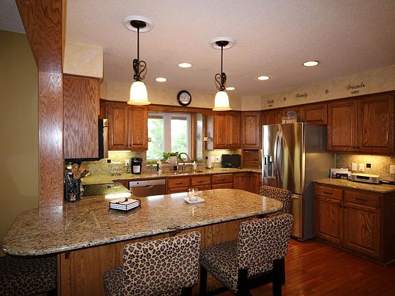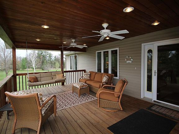 Stunning 5 acre setting! The charming front porch will welcome you home! Large living room has gas fireplace w/stone surround. Dream kitchen includes granite counters, breakfast bar, pantry, loads of cupboard space and beautiful SS appliances to complete your dream. Dual laundry rooms, a master suite w/walk-in closet, full bath w/jetted tub, dual sinks and makeup area. Attached garage is heated and finished. 40x30 outbuilding w/concrete floor and large RV door in rear. All the amenities here!