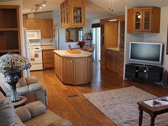 If you are looking for a retirement place, here is a very well-maintained 2001 single-wide manufactured home on a nice lot with garage. RV access and hookup with parking on a concrete pad compliment the nicely furnished home. The large screened AZ room is nice bonus space, and you will also be amazed at the spacious feeling inside the home. Built-in bookcases, kitchen island, and storage galore are nice features -- come take a tour today!
