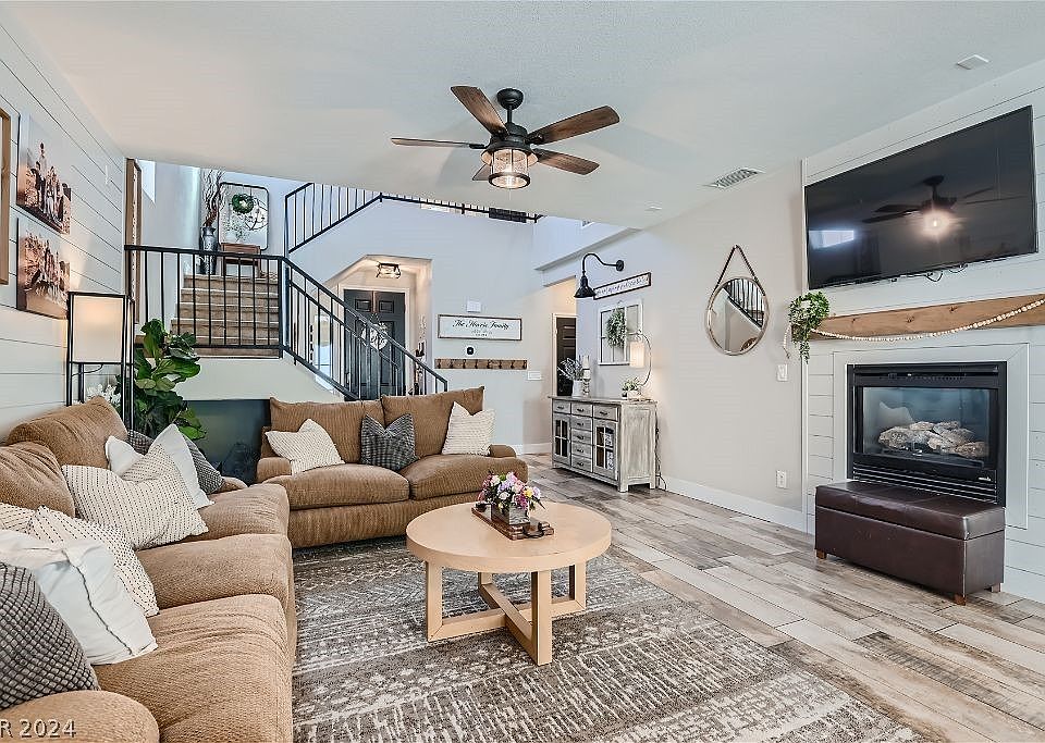 Experience farmhouse-style living in this stunning 5-bedroom home. Downstairs boasts custom tile flooring complemented by shiplap accents in the living room, enhanced by modern farmhouse lighting fixtures. The kitchen dazzles with a subway tile backsplash and walk-in pantry. Take a stroll up the custom wrought iron staircase to see the other 4 bedrooms and a large loft that overlooks the entryway. Step outside to a fully landscaped, and spacious backyard, complete with a covered patio, gorgeous artificial turf, palm trees, shrubs, and an irrigation sprinkler system. Community amenities include pools, spas, exercise gems, playground area, and an incredible community center offering meeting rooms and event spaces. Don't miss the chance to make this your dream home!