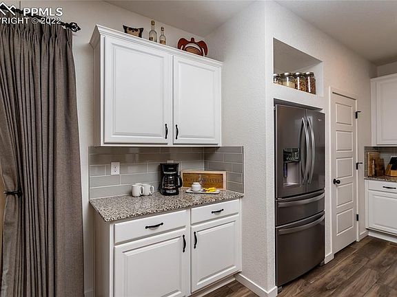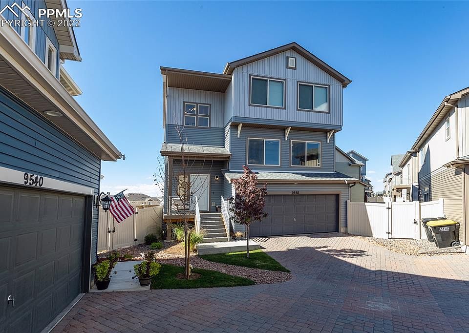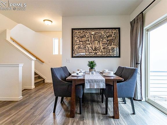 Welcome to this 4 bedroom, 4 bath, 2 story, 2 car garage home in Banning Lewis. On the main level is the kitchen that has a LARGE breakfast bar island, all stainless steel appliances included and lots of cabinet space with granite countertops. Off the kitchen is the dining area where you can enjoy your morning coffee as you take in the great Pikes Peak view or step out onto the balcony to enjoy the fresh air with the view. There is a large living room off the kitchen that has great windows to bring in the light, a coffered ceiling, ceiling fan and is pre-wired for sound. On the upper level is the large master bedroom that has a great Pikes Peak view, ceiling fan and adjoining bath. The master bath features a double vanity, oversized shower and walk-in closet. There is a full bath, laundry room and two additional nice size bedrooms, one with a walk in closet on the upper level. Going to the lower level there is family room, entry from the garage, 3/4 bath, and bedroom/office with a walk-out to the back yard. There is luxury vinyl flooring on the main and lower level. The backyard is xeriscaped with turf and has a brick paver patio that is pre-wired for sound. Don't worry about shoveling snow or mowing the grass, this is a zero maintenance lot that the HOA provides. Take advantage of the neighborhood amenities- parks, trails, clubhouse, gym, pickleball courts, basketball courts and pools.