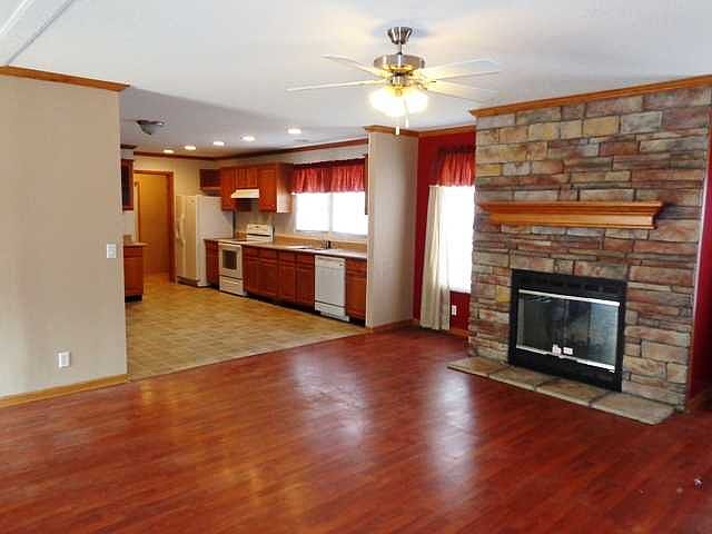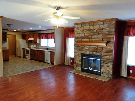 Owner Will Finance. Laminate hardwood as you enter,open to Dining Area & Kitchen, & breakfast area.Range, Fridge, window treaments stay! All this plus 4 pretty acres, sits off road, secluded but close to town if needed. Wood burning fireplace. New Carpet & paint. Call to see if you qualify for free down payment money from the state.