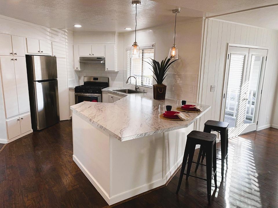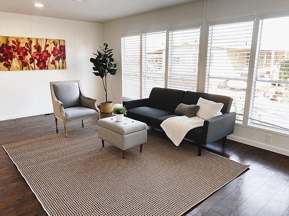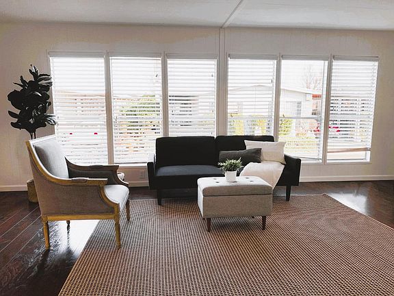 Stunning remodel! Low Space Rent-$951. No Property Taxes. Triple-Wide, 1644 sq ft! A charming, white kitchen with stainless appliances and a spacious kitchen counter for lots of guests to sit. Great for entertaining! Large Living Room. Kitchen is open to the Family Room. Office area with built-in cabinetry. Bathrooms with new vanities and toilets. Tub/Shower combination. French doors enter out to the porch. Double sided walk-in closet. Wood blinds for great light to come in and privacy when needed. Gorgeous dark, hardwood floors. Laundry Room with a substantial amount of space for items. Washer and dryer included. Upgraded shed for storage. Airconditioning. Located in the highly desirable park, New England Village. This is a 55+ park. Buyers must apply at the park for residency after entering into contract.