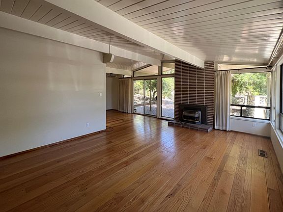 Enjoy living in a classic Mid-Century Modern 3 bedroom/2bath home in walkable, cyclable downtown Lafayette. No need to drive to Trader Joe's, Whole Foods, BART, or the many popular nearby eateries. The spacious living room and dining room open to a relaxing shade-dappled deck. A bright eat-in kitchen with stainless steel appliances and plenty of storage also has yard access. The main bedroom with ensuite bath comes with its own private patio. Two other bedrooms share an updated bathroom and could also easily serve as home office or guestroom. The three bedrooms share a central hall which can be closed off from the social rooms if more privacy or quiet is needed. In addition to generous closet space in each bedroom, there is a convenient coat closet in the entry, a sizeable linen closet in the bathroom and a bonus closet in the hallway. Central heat/AC, high ceilings, and hardwood floors. This desirable downtown duplex has an on-site laundry as well as both garage and permitted street parking. Yard maintenance is included. Pets possible. Security deposit-one month's rent. Tenant pays utilities