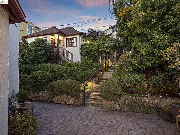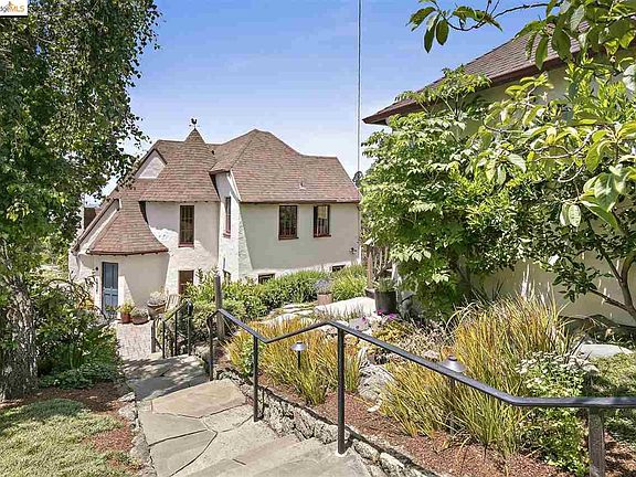 Tall ceilings, light filled rooms, spectacular conch-like spiraling staircase graces this Normandy home. As you enter, you are drawn in by the stunning views of the City and San Francisco Bay from the living room, large enough for your baby grand. Cozy and inviting sun room with skylights galore, a tranquil retreat to enjoy a good book! Tasteful remodeled eat-in kitchen, perfect for dinners for two or a small dinner party. Two bedrooms at the top of the turreted stairs with remodeled bath. Two additional bedrooms and full bath on the lower level w/access to the backyard. separate enough to be used as an in-law. Separate rebuilt 2 car garage with level entrance, big enough for 2 cars and storage or a perfect Studio. Enclosed yard for the kids, furry or human! Many upgrades including AC.