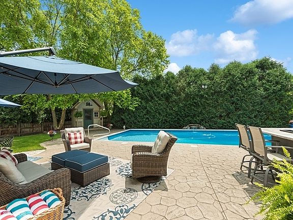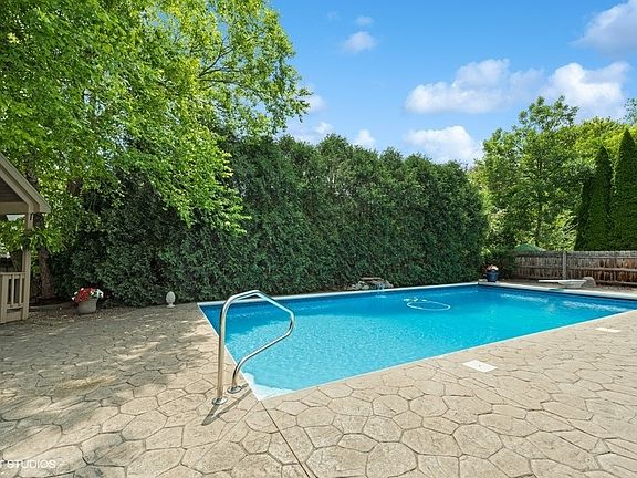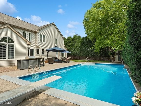 Resort Style living! 19 x 36 ft. heated inground pool, with waterfall feature, diving board, auto cover, pool vacuum cleaner, all surrounded by a stamped concrete Patio. Charming outdoor shed (custom built like a house), gas grill and propane bar fireplace table/w chairs, there is even an extra gas hook up if you want to install a firepit. Fenced yard and privacy landscaping. Rarely available Stafford model w/upgrades. 2 Story Entrance, double sided fireplace to warm the LR. and FR. Upgraded Kitchen , Quartz Counters, Island, counter for stools, 5 burner cooktop, built in oven, newer refrigerator, can lights and an eat in area with great view of the pool. Butler pantry leads to dining room ( currently being used as a TV room). First floor also features an office with a built in hall tree for extra storage. Hardwood floors and Plantation shutters in LR., DR., and FR. First floor laundry with exit door to backyard and flagstone patio. Second story Landing leads to double doors to Master bedroom w/ walk in closet, remodeled Master bath with walk in shower and a separate tub. Second bedroom has a vanity and lights on one wall. Two other nice size bedrooms and a full hall bath. All bedrooms have ceiling fans. The finished basement has a large finished rec room, play room ( can be a 5th bedroom has closets just needs a door ) and a Pub Bar room. There is a storage room and a Full bathroom with a Kohler steam shower to complete the resort lifestyle. 2 car garage with cabinets and shelves for more storage, extended driveway and even a basketball hoop. Roof is new in 2023. Great location close to expressway, shopping, and parks. Amazing home and lifestyle await new owners!