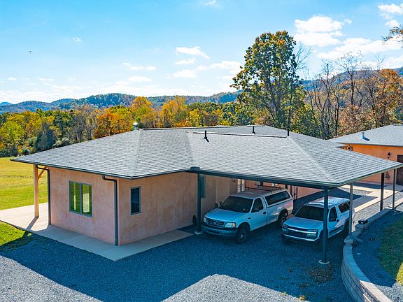 A country road and lane lead to the gated farm. The simple, modernistic lines of the home and matching guest cottage, and the large solar panel array behind them announce that this isn't a traditional rural property. The home's walls utilize hempcrete, a unique breathable material that is mold and rot resistant, and the exterior walls are finished with an attractive earth-tone stucco. The roof has architectural shingles. A large carport with recessed lighting is incorporated in the structure.