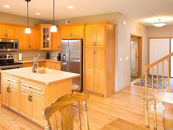 FIVE CAR ATTACHED GARAGE; 3 in front and 2 tandem. One w/7' height door & the other w/8', Front porch that will fit your furniture in this custom Kingsborough Home. The umbrella heating system keeps your upstairs cool in the summer! Clever 20x15 recently finished bonus rm above gar; trusses are in so you can put a staircase in from gar. Oak flooring has just been refinished; looks brand new in entry, kitchen & dinette. Brand new siding & SS appliances for years of ease.