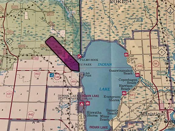 Looking for a family recreation camp with lake frontage? Two parcels connected with a 1.99 acre vacant lot on Indian Lake offering 200' of frontage. Sandy bottom with level ground access to lake. Connecting to a mobile home lot with garage and workshop. Pump house in garage with drilled well. Great location in the Ash resort area of Indian lake, close to trail system, Big Springs, Superior State Forest and Hiawatha National Forest. Only minutes from Manistique. Indian Lake is 8400 acres and Michigan's fourth largest lake. Great opportunity to make life long memories. Survey in documents for 1.99 water front lot. Garage on vacant waterfront parcel needs repair.