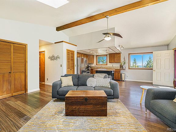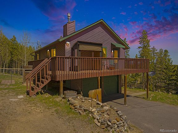 PRICE REDUCTION!!! Refreshed price and refreshed interior! This gem sits on two gorgeous private acres with fabulous views from every window and a wrap-around deck just waiting to host your next gathering. The main floor features an open concept living, kitchen, dining area, a primary bedroom suite with full bath, a secondary bedroom, guest bath, beautiful bamboo floors, new gas free standing stove/fp and two doors to access the beautiful deck. The kitchen has been refreshed with with new stainless steel appliances. The lower level features a family room with gas (propane) free-standing fireplace, an office that is being used as a non-conforming bedroom, a full-bath, laundry room and access to the oversized 2 car garage with built-in work-bench. The fresh paint, updated windows, vaulted ceilings, and skylights let in the Colorado sun. The outside does not disappoint with plenty of gathering spaces, full fire mitigation, a paved driveway, split rail fence on the property line and a fully fenced front yard. You will also have plenty of storage for your toys with two sheds, one with electricity, and a fixed in place fully enclosable portable carport. Corsair is a well maintained road, perhaps because it happens to be on the bus route for all three schools. Schedule your showing today and come see for yourself. In the photos, the stainless steel appliances, installed post-photography, have been virtually staged.
