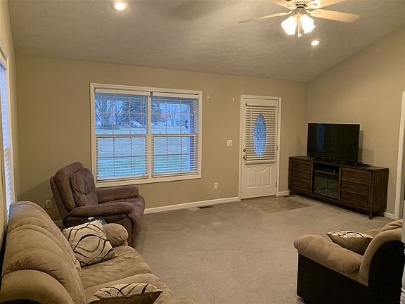4 bedroom/3 Full Baths on half acre in rural location but close to all amenities. Spacious living room with vaulted ceiling. Kitchen/Dining Combo has beautiful cabinetry, island and all appliances included. Laundry area is on main level, washer and dryer are included as well. Master suite with trey ceiling, walk in closet and jet tub. Second and third bedrooms are also located on the main level. Upper level features a 4th bedroom and bath. Home has a front covered porch and open patio in back. 2 car detached garage. Call/Text Susie 812-605-0764
