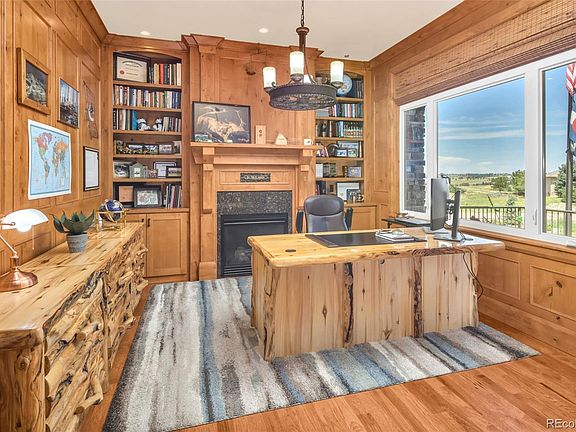 The main-level primary bedroom boasts its own fireplace and deck access. The recently updated spa-like bathroom features a lavish soaking tub, a spacious walk-in shower, and two walk-in closets. The private main floor office has its own fireplace, built-in cabinets, and shelves.