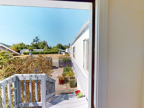 Seriously Adorable 2 bedroom 1 bath located in a Riverside MH/RV Park. Up river from town approx 4 miles out of the wind and fog. Single wide home in great condition. Fenced front patio area with mature landscaping, backyard is also fenced and has room for gardens. Bonus apple tree. Carport with shop area. Plenty of extra storage.