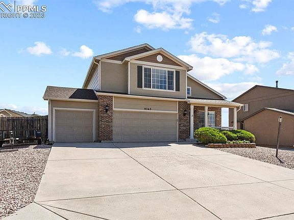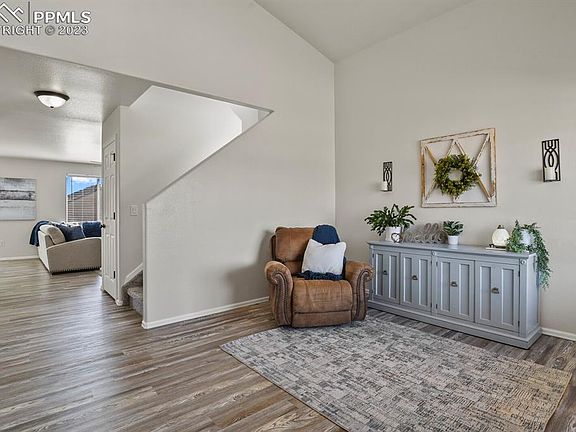 Welcome to this gorgeous 2-story home in the beautiful Peyton neighborhood of Paint Brush Hills. This stunning home boasts 4BRs, 3 baths, and a 3-car garage. Spectacular Pikes Peak and mountain views. No HOA fees. As you step onto the covered front porch, you can just feel the warmth and charm of this home. Once inside, you'll be greeted by an open floor plan w/spacious living spaces that are perfect for entertaining. The beautiful LVP floors throughout the ML add a touch of elegance and durability. The formal living rm w/soaring vaulted ceilings is a great place to sit and relax after a long day. The family rm features a lighted ceiling fan, gas-log fireplace w/brick surround, and convenient access to the dining area and kitchen. The butcher block island kitchen provides ample cabinets and countertops for storage and food prep. Stainless steel appliances, including a smooth top range oven, built-in microwave, dishwasher, and side by side refrigerator, make cooking and cleaning a breeze. There is a slider out to the backyard patio where you can enjoy the Colorado sunshine. There is a main level powder bathroom and laundry room with garage access. The UL offers 3BRs, 2 Bathrooms, and a versatile upper-level loft w/neutral carpet and recessed lights. The primary suite includes a lighted ceiling fan, walk-in closet, and adjoining 5pc bathroom w/dual sink vanity, tub, and separate shower. 2 more BRs share a full hall bathroom w/vanity and tub/shower. The finished basement features a 4th BR and huge rec/family rm, adding even more room to this already spacious home. The fenced backyard provides a patio for outdoor relaxation and BBQs, and a storage shed for tools and toys. You'll love the location of this home, close to great D49 schools, parks, and shopping. For the golf enthusiast, Antlers Creek Golf Course is just two miles away. With central air and heat, this home will keep you cool in the summer months and warm in the winter. Don't miss out on this beautiful home!
