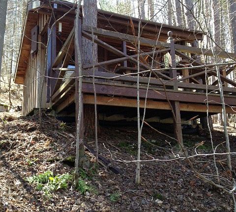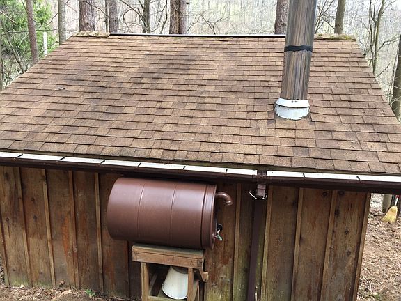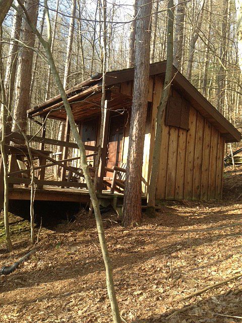 The cabin is 8 x 12 and is fully insulated. Entering the cabin, which is finished with knotty pine, creates a very comfortable feeling. It has two built-in bunk beds, nice kitchenette, and a wood stove to keep the cabin very toasty during the cool days and nights. There is a barrel mounted on the back side of the cabin for your water needs. The cabin is built on a concrete slab. Nice windows, including a stained glass window. Walk out onto a large 10 x 12 porch and listen to the small stream while enjoying your morning coffee. Also, there is an outhouse.