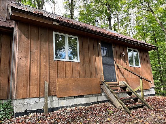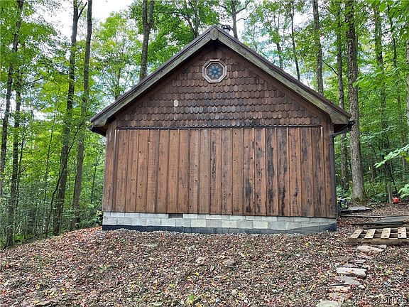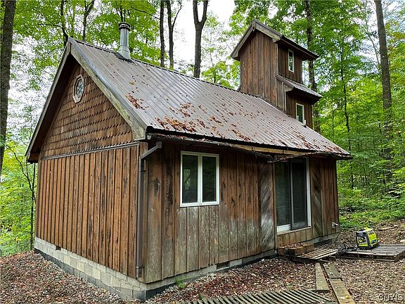 Cabin on 9 acres located in Little Valley NY, Cattaraugus County. This one-of-a-kind, 3 story cabin offers a spacious first floor which includes a living room area, full kitchen with cupboards and dining area. The second level offers a 2 bed sleeping, and the 3rd level can also be used as a sleeping area. The cabin has approx 800 sq. ft., tongue and groove interior, wood stove for heat. Electric throughout, powered by a generator. There is a bathroom inside the cabin but no plumbing is connected, currently no septic or well. Completely redone block foundation. Clean outhouse nearby. Great hunting parcel. Bucktooth State Forest has 2,248 acres of public land to hunt, hike, and explore and is only 2.5 miles away. All rights convey. Consists of 71.002-1-(25/26.3/26.4). This is a great place if you are looking for a getaway with peace and seclusion. Note: There was a prior roof leak in ceiling which has discolored the boards on the interior ceiling, the leak has been fixed with a new roof and interior ceiling boards need to be replaced by new owner.