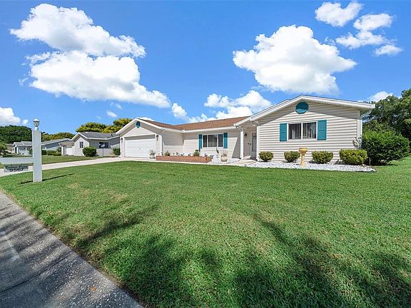 This this beautifully maintained 2-bedroom, 2-bath home is nestled in the heart of the vibrant 55+ gated community of Spruce Creek South in Summerfield, FL. This expanded Palm III model offers a spacious and inviting layout with vaulted ceilings, abundant natural light, and elegant crown molding accents throughout. The open-concept living and dining areas flow seamlessly into a bright, eat-in kitchen featuring ample cabinetry, pull-out drawers, and a pantry for effortless storage. Just off the living space, an enclosed sunroom with acrylic windows provides the perfect year-round spot to relax or entertain. The primary suite offers a peaceful retreat with a walk-in closet, additional storage, and a private bath with walk-in shower, while the guest bedroom also includes its own walk-in closet. A dedicated laundry room with utility sink and storage adds everyday convenience, and the oversized 2-car garage offers even more functionality. Outside, mature landscaping and a 2019 roof provide peace of mind and charming curb appeal. Residents of Spruce Creek South enjoy access to a clubhouse, fitness center, pool, tennis, pickleball, golf cart trails, and more — all with a low monthly HOA. Whether you're looking to unwind or stay active, this move-in-ready home delivers the perfect blend of comfort, style, and Florida lifestyle living.