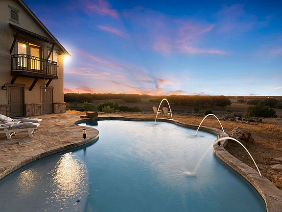 Luxury Hill Country Retreat with Panoramic Ranch Views, a Pool & River Access! Welcome to your private Hill Country escape-an exquisite 1.5-story custom estate set on 5 peaceful acres with access to the Guadalupe River. From the moment you step inside, you're greeted by breathtaking ranch views framed by expansive picture windows that fill the home with natural light and showcase the beauty of the surrounding landscape. This thoughtfully designed residence features five bedrooms, four full and two half baths, and over 4,000 sq. ft. of refined living space. The open-concept layout flows effortlessly from the grand living room-anchored by a striking stone fireplace AND beamed ceiling-to the chef's kitchen equipped with a large island, double ovens, propane cooktop, custom cabinetry, a breakfast bar, and a walk-in pantry. The primary suite captures peaceful Hill Country scenery through large windows and includes a spa-inspired bath and an oversized walk-in closet. Tucked discreetly within the closet is a hidden safe room, ideal for secure gun and valuable storage. High ceilings, wood and tile flooring, and warm finishes throughout add timeless charm and sophistication. Upstairs, a spacious bonus room with balcony overlooks the property, while a private study and formal dining area provide both function and elegance. Step outside to your Hill Country paradise-complete with an in-ground pool, covered patio with a fireplace and an outdoor kitchen featuring a built-in grill, and plenty of shaded seating beneath