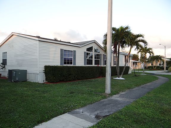 This mobile-home is a floor plan featuring three well-proportioned bedrooms and two full baths. You will love the pretty colored walls and upgraded light fixtures and/or ceiling fans that add flair to home. The kitchen, the dining area, the living area, utility room, bathrooms and one room all have large neutral-colored tiled flooring nicely finished with baseboard molding, while two bedrooms (including master bedroom) have attractive carpet. All windows are dressed with pretty blinds throughout this home Just look at this beautiful and spacious kitchen featuring all new stainless steel appliances (including a side-by-side refrigerator with ice, smooth top range, built-in microwave, and dishwasher), ample counter space and cabinetry, dual bowl stainless steel sink with convenient goose-neck faucet and sprayer, and charming coffee/snack bar. Off the kitchen is a practical laundry utility room with brand new washer/dryer. The spacious bedrooms have walk-in closets that offer plenty of storage space and the two bathrooms are recently renovated. The master bath has a huge tub, separate shower stall, ample storage and his-and-her sinks and vanity with his-and-her sinks and finished with modern faucets. French doors lead to a nice charming covered porch. Outside, this home is located on a quiet, peaceful and pretty street, featuring decorative garden, lovely landscaping (including 7 palm trees!). Finally, off-street covered parking (up to 4-5 cars) with a storage shed, and you can have access to the community's extensive recreational amenities. CA$H ONLY. CALL AT 954-770-2396 HABLAMOS ESPANOL.