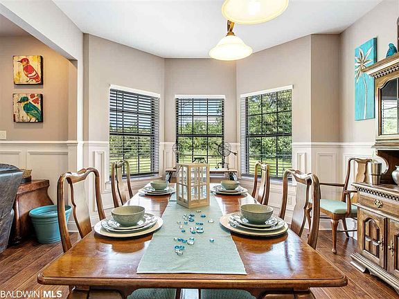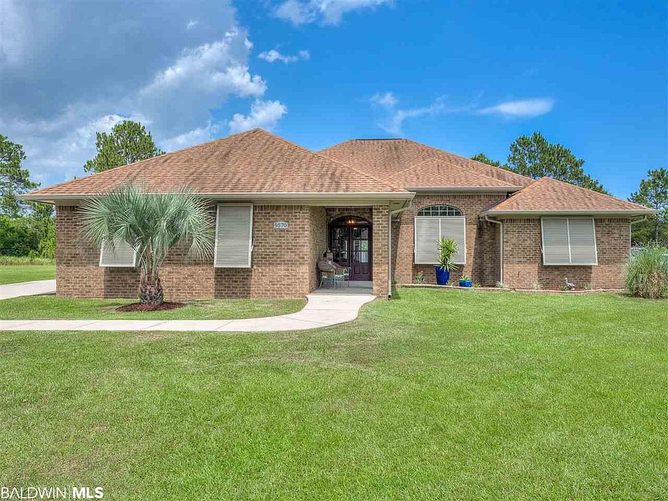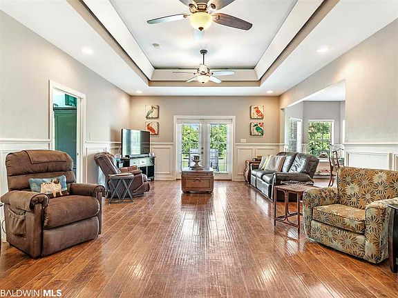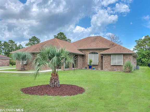 One of a kind custom home in Foley. 3 spacious en suites which includes 2 masters. The main master bedroom has a bath with garden tub, zero entry tiled shower with seat. Grab bars, handicap accessible cultured marble vanities, Flexitec flooring, his & her closets and separate HVAC system. The 2nd master has a large (4 x 5) cultured marble shower and walk-in closet. There is a study, formal dining room with soaring coffered ceilings, wainscoting and picture mold. interior doorways 36" for ease with a wheel chair or walker. Home was designed for adult children caring for aging parents. All home entrances (porches, master bedrooms and garage) have ramped access. Also included is a breakfast room, large great room (15 x 25), accessible laundry room with utility sink. Oversized garage (22 x 23) accommodates most trucks. Bahama hurricane shutters on front, gutters, solid surface counter tops in kitchen/stainless appliances, soft close hinges, pull out drawers, tankless water heater. All wet areas feature Flexitec flooring (a durable type of vinyl designed to be more gentle on the joints than tile).THIS IS A MOBILITY FRIENDLY HOME. Call right away to schedule a showing. Golfing and Social memberships are reasonably priced and available through the Clubhouse.
